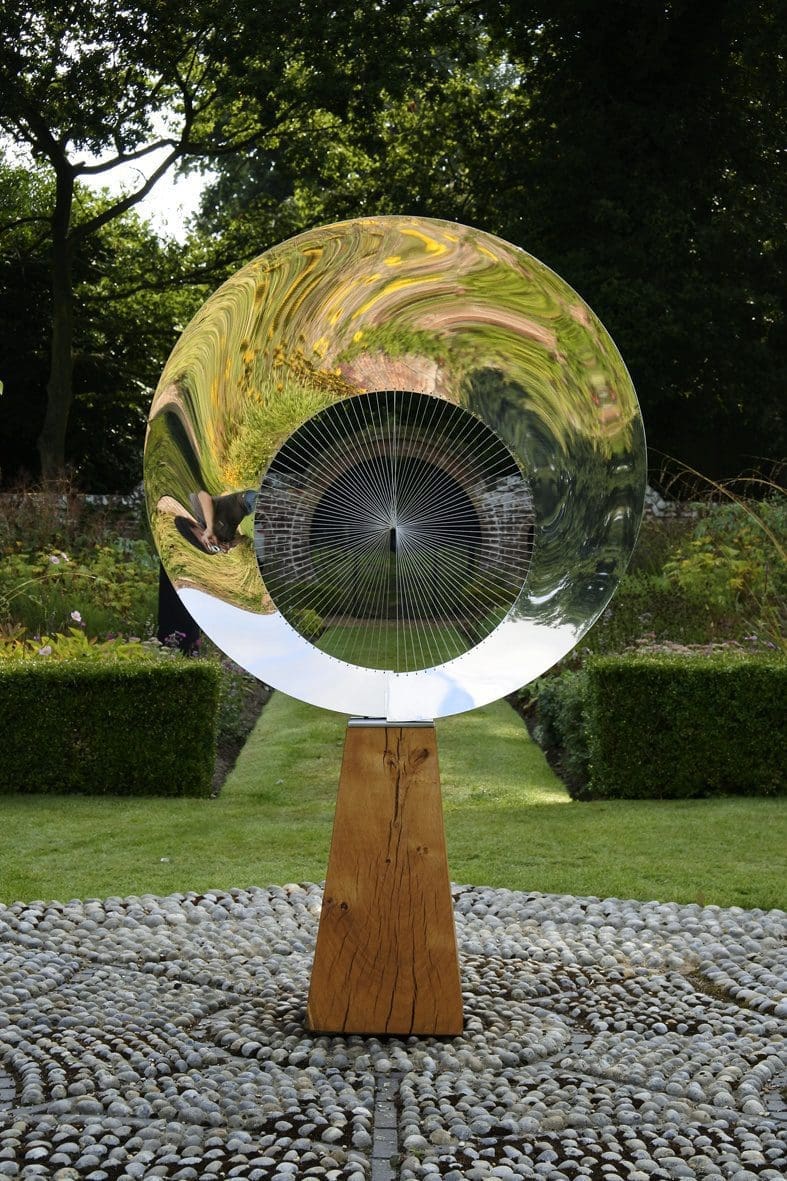 Circular mirror polished stainless steel abstract sculpture