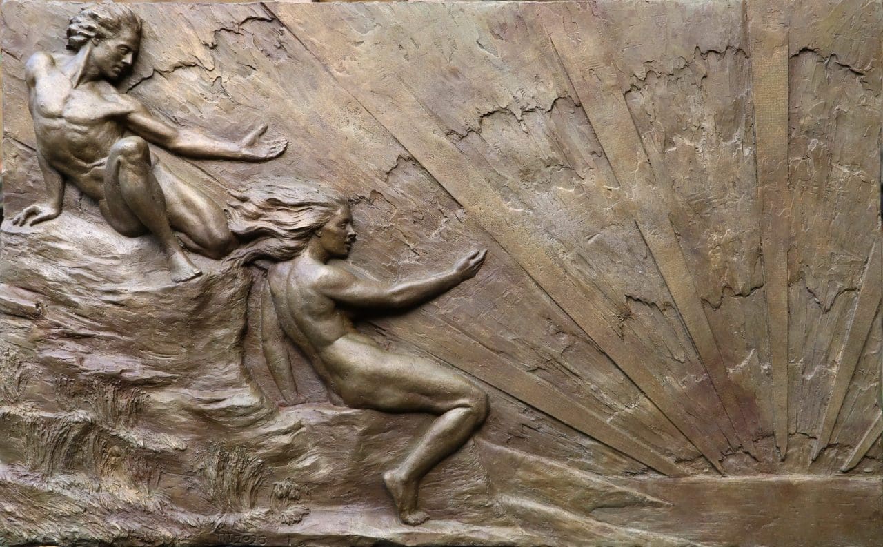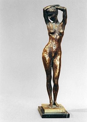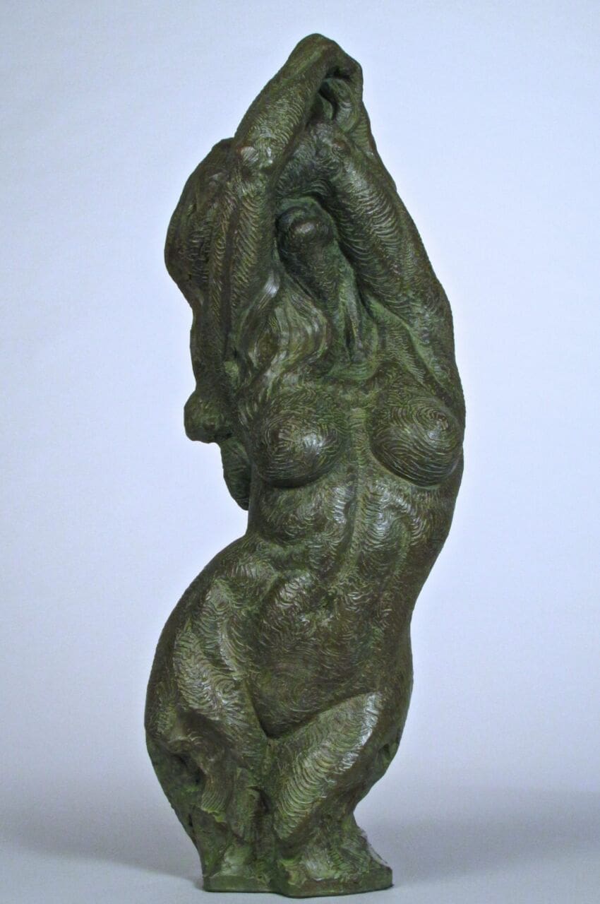 Mother in Waiting is a contemplative figurative sculpture capturing the quiet strength and vulnerability of pregnancy. Cast in plaster from an original made of recycled car panels, it reflects on the emotional and physical transformation of motherhood an intimate pause in time, filled with anticipation, creation, and quiet power.