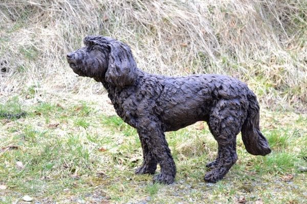 For instance, bronze, and to a lesser extent bronze resin/cold cast bronze, will acquire a green patina, usually rather sought after. All can attract moss, lichen, and a greenish pollen, especially under trees, which should be removed regularly with warm water and washing-up liquid.