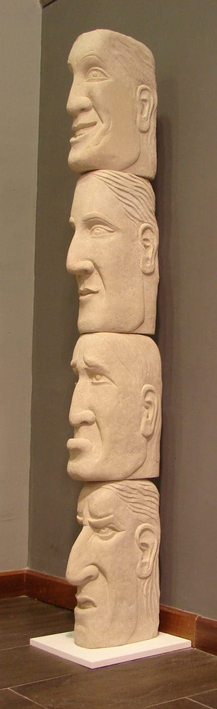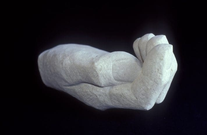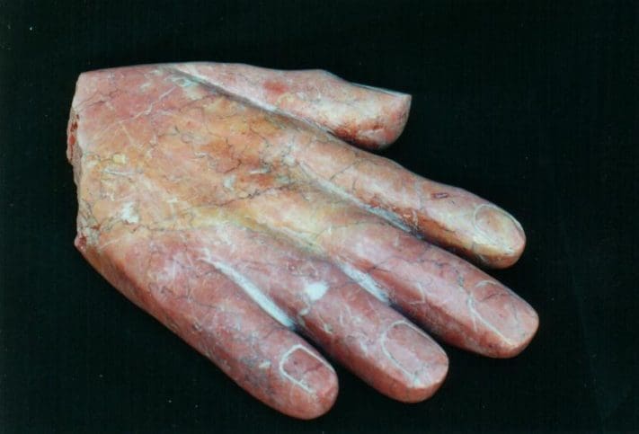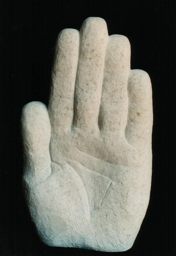 A large carved hand holding a stick of charcoal