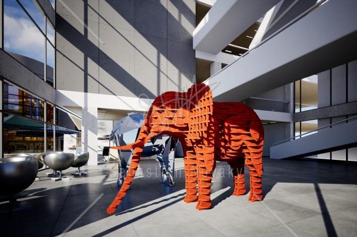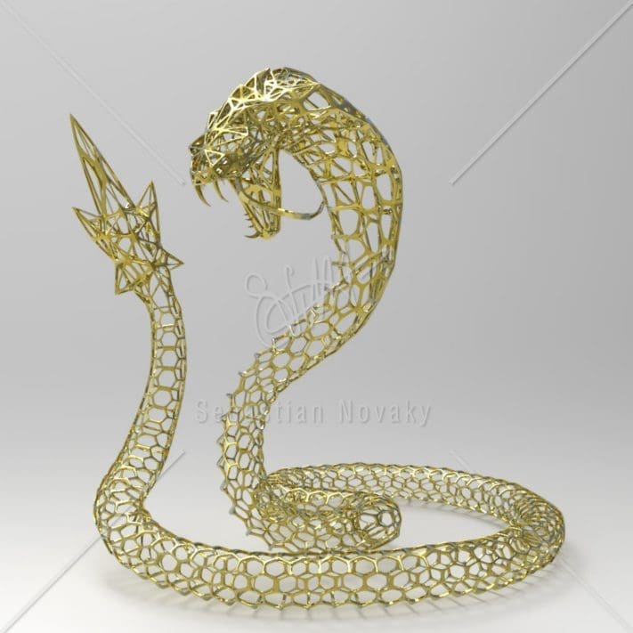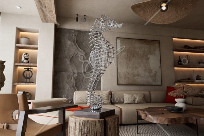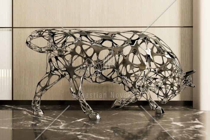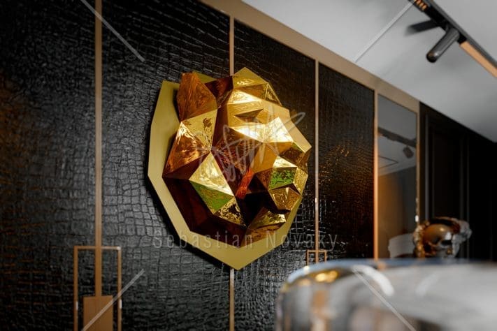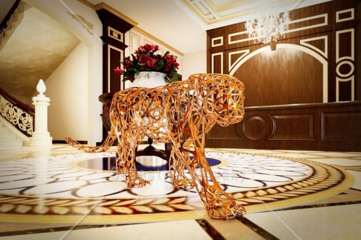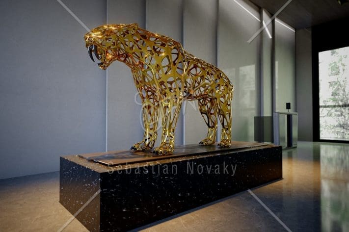 Prowling Leopard in Stainless Steel Sculpture, by Sebastian Novaky, who adds “Should one have the opportunity to touch it, the smooth and cool texture of the stainless steel offers a tactile experience that is both luxurious and modern. It’s a sensation that evokes a sense of refinement and high-end craftsmanship.