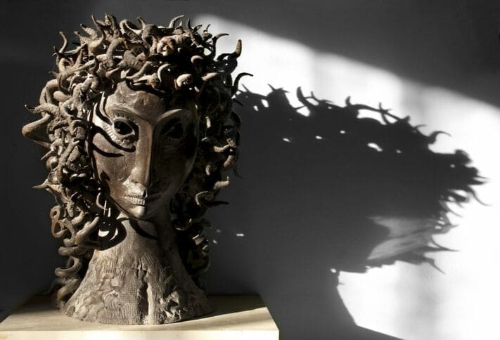 For instance, bronze, and to a lesser extent bronze resin/cold cast bronze, will acquire a green patina, usually rather sought after. All can attract moss, lichen, and a greenish pollen, especially under trees, which should be removed regularly with warm water and washing-up liquid.