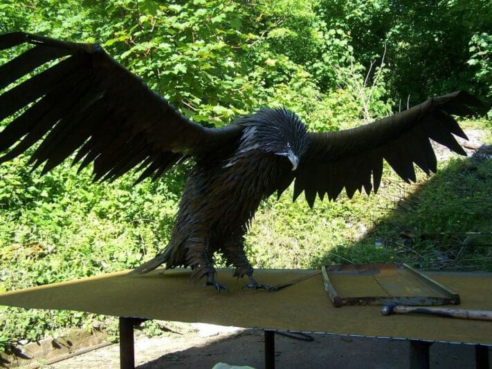 A life size Red Kite made from mild steel for sale, rusted for patina then sealed with wax oil for outside display in the garden, the yard, the estate or park by raptor man sculptor Ramsey Dick. He Writes….