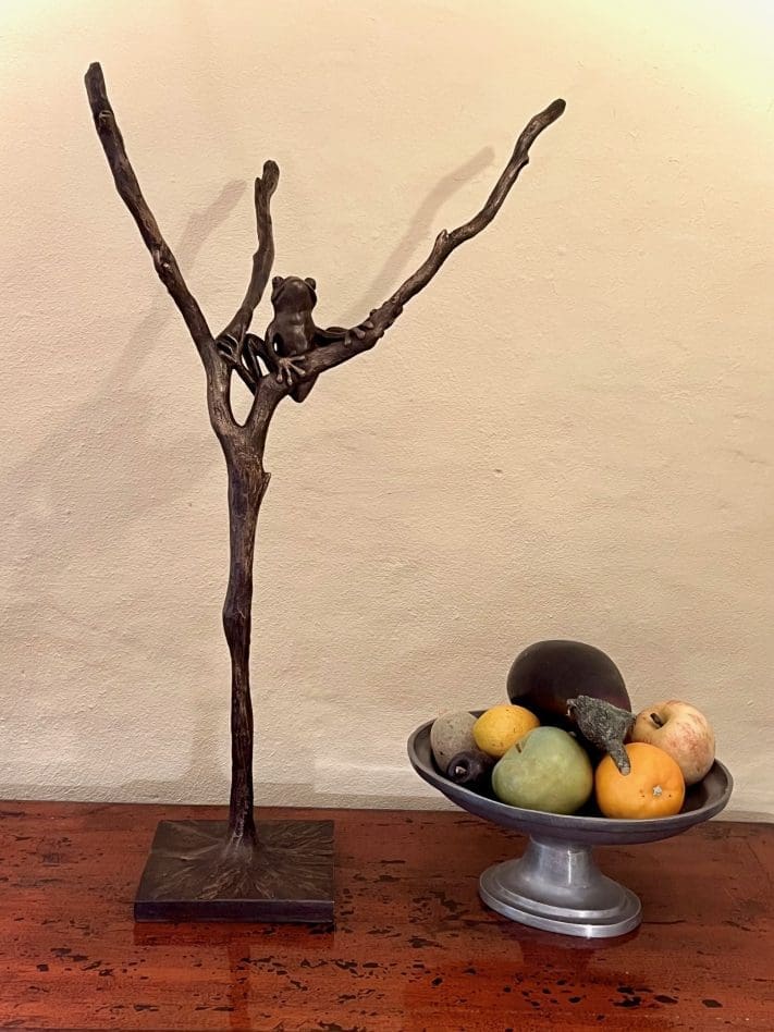 For instance, bronze, and to a lesser extent bronze resin/cold cast bronze, will acquire a green patina, usually rather sought after. All can attract moss, lichen, and a greenish pollen, especially under trees, which should be removed regularly with warm water and washing-up liquid.