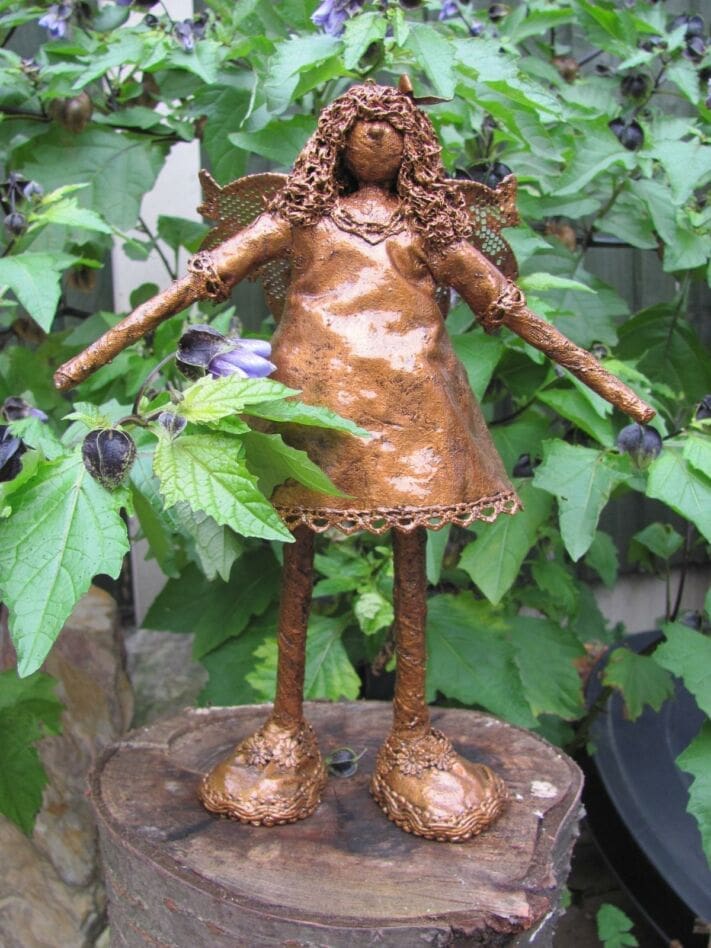 For instance, bronze, and to a lesser extent bronze resin/cold cast bronze, will acquire a green patina, usually rather sought after. All can attract moss, lichen, and a greenish pollen, especially under trees, which should be removed regularly with warm water and washing-up liquid.