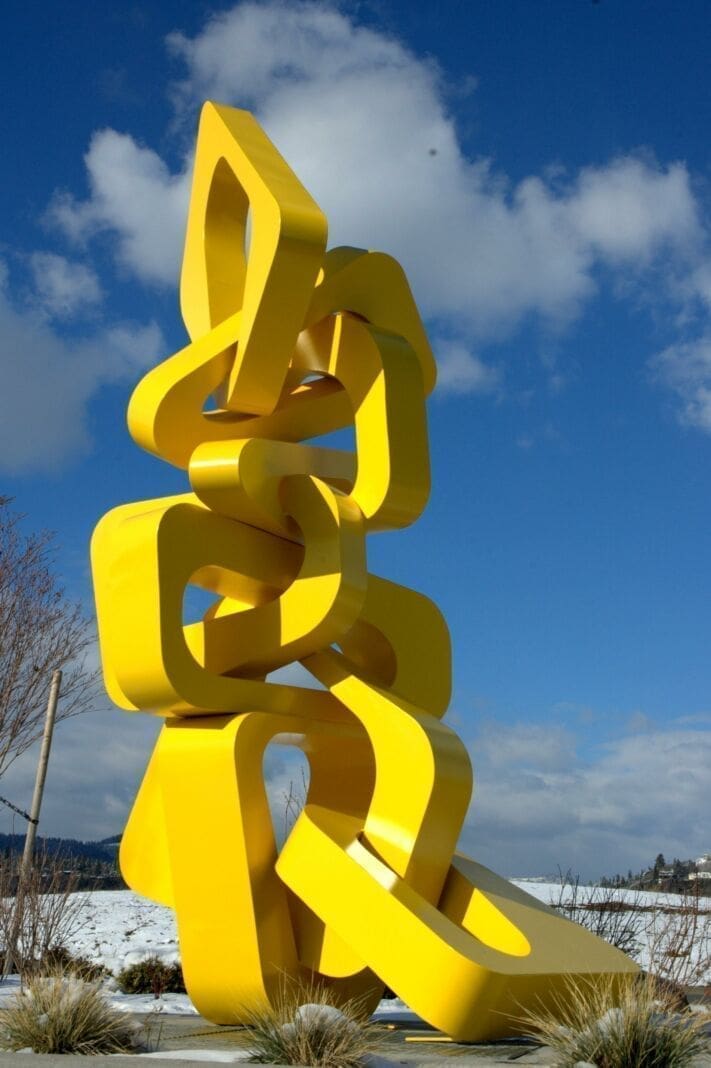 Thin Abstract Curved Steel Tall Minimalist sculpture. Large Red Coloured Modern Metal Wind Motivated statue, for Outside Outdoor External Use in the Garden or Yard or Public Space. Engineered by the American Sculptor Chris Rench who writes…